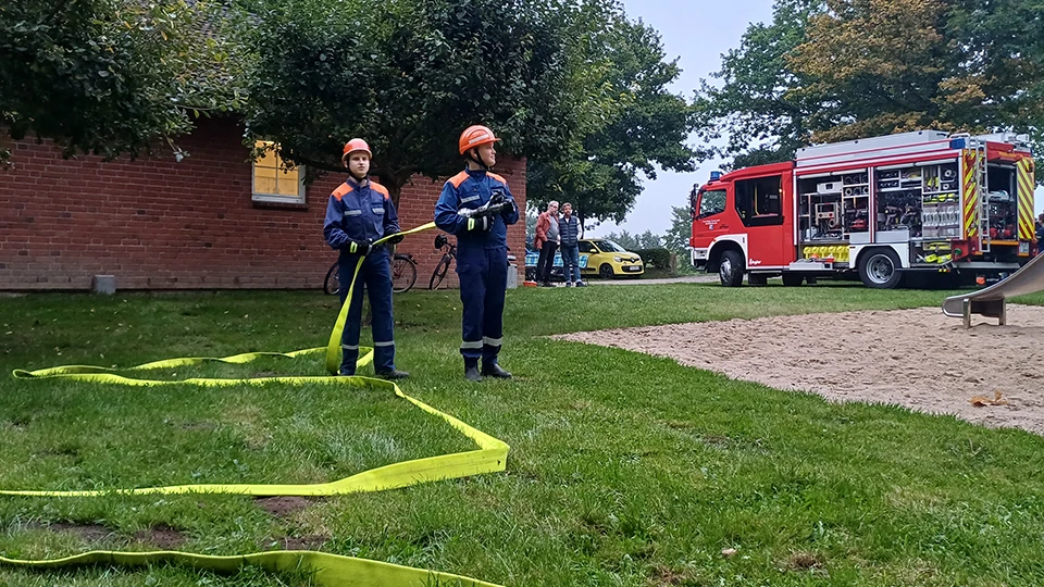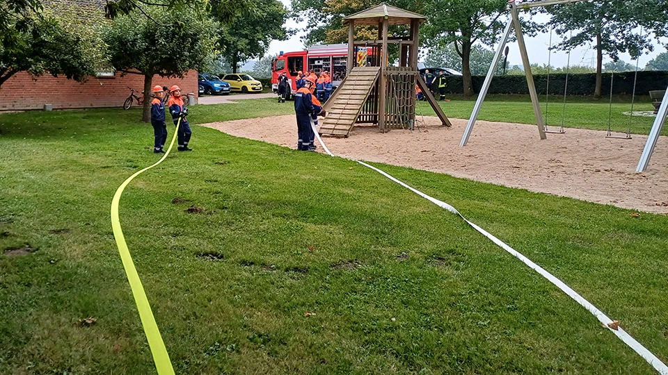 Unterstützt von den „Großen“, inklusive den Feuerwehrfahrzeugen, wurde der abendliche Dienst auf dem Freigelände am Dörfergemeinschaftshaus Tröndel an mehreren Stationen zur Ausbildung genutzt. Nach einer kurzen Ansprache durch Jan Schlünzen schwärmten kleinen Retter aus und los ging es. Von Erster-/Kameradschaftshilfe, Fahrzeug-/ und Gerätekunde bis hin zum Aufbau einer Feuerlöschstrecke wurden alles geboten.